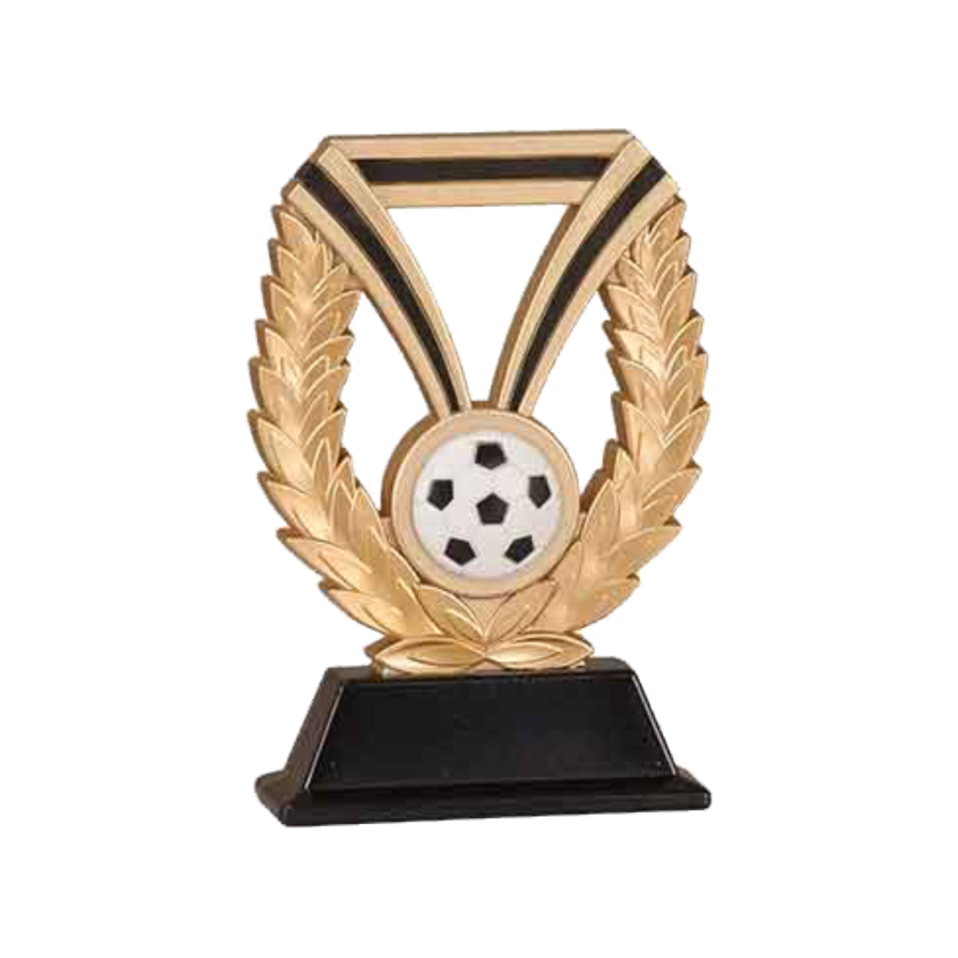 A gold and black ribbon with a soccer ball draped across an antique gold Victory Wreath.