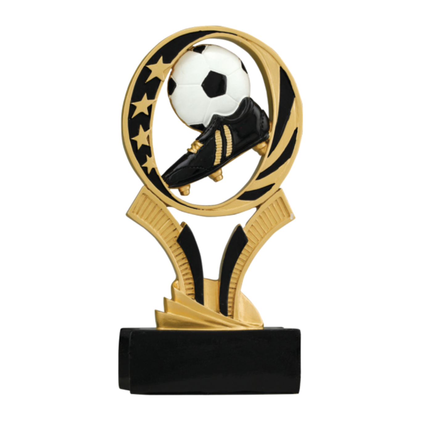 Soccer ball and soccer boot in a black and gold ring with stars. Stands on a flat 5 point star.[bc-description action="end description"]