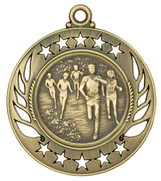 2 ¼ inch Galaxy Cross Country Medals are offered in 3 colors- Antique Gold, Antique Silver, and Antique Bronze. We can place a full-color 1 ½ inch disc on the back or customize it with rotary engraving on the back of the medal for added personalization. A 7/8" x 32" neck ribbon is included in the price, and you can select your preferred ribbon when customizing the medal in our design lab.