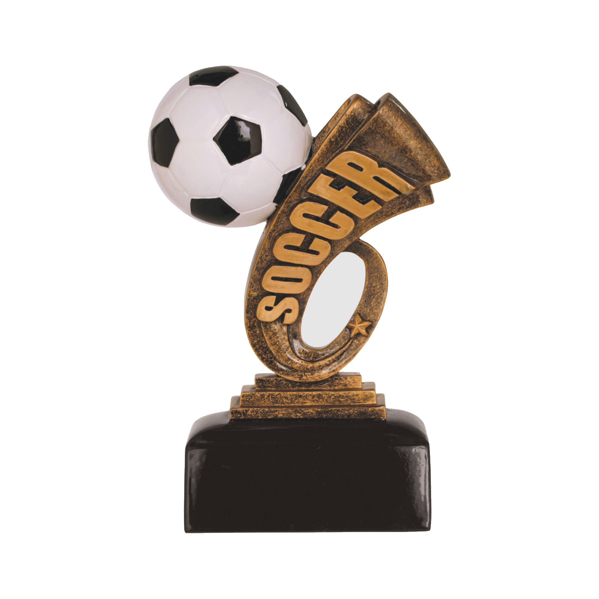 A black and white soccer ball over a two toned antique gold soccer headline mounted on a black base. Enhance the aesthetics of your soccer awards collection by displaying this stunning soccer headliner award on its sleek black base. With its two-toned antique gold finish and classic black and white soccer ball design, this award exudes a timeless elegance that will impress any viewer.