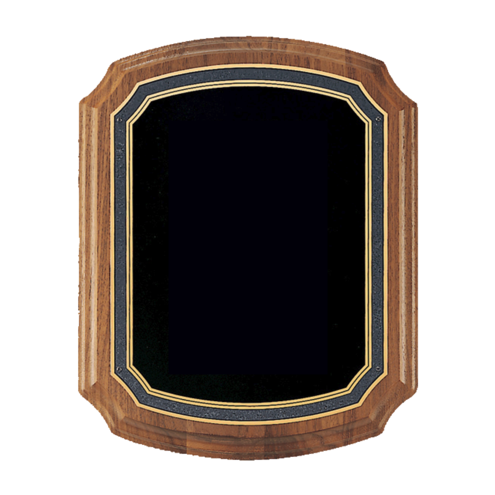 Black Brass with a Florentine Border: The plaque comes with a black brass Florentine border engravable designer plate. It is intricately designed to enhance its elegance and provide a striking contrast to the walnut wood. The detailed border adds an element of luxury and refinement.